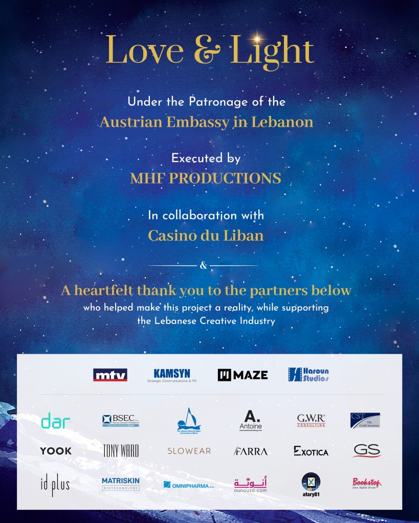 The Love & Light Orchestral Theatrical Christmas Concert, was held Under the Patronage of the Austrian Embassy in Lebanon, MHF PRODUCTIONS, in collaboration with Casino du Liban with the support of the strategic partners MTV, KAMSYN PR, MAZE, LIBRAIRIE ANTOINE and HAROUN STUDIOS. The concert was held without an audience at the Casino du Liban, in accordance with COVID-19 safety measures and restrictions.